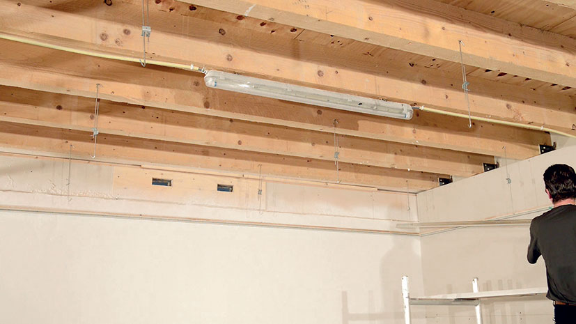 Podľa vynesenej roviny sa na steny upevní obvodový profil. Ten sa kotví plastovými natĺkacími rozperkami, prípadne inými vhodnými pripevňovacími prostriedkami podľa druhu obvodových konštrukcií. V pravouhlých kútoch a rohoch sa zastrihnú obvodové profily pod uhlom 45°.