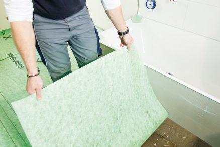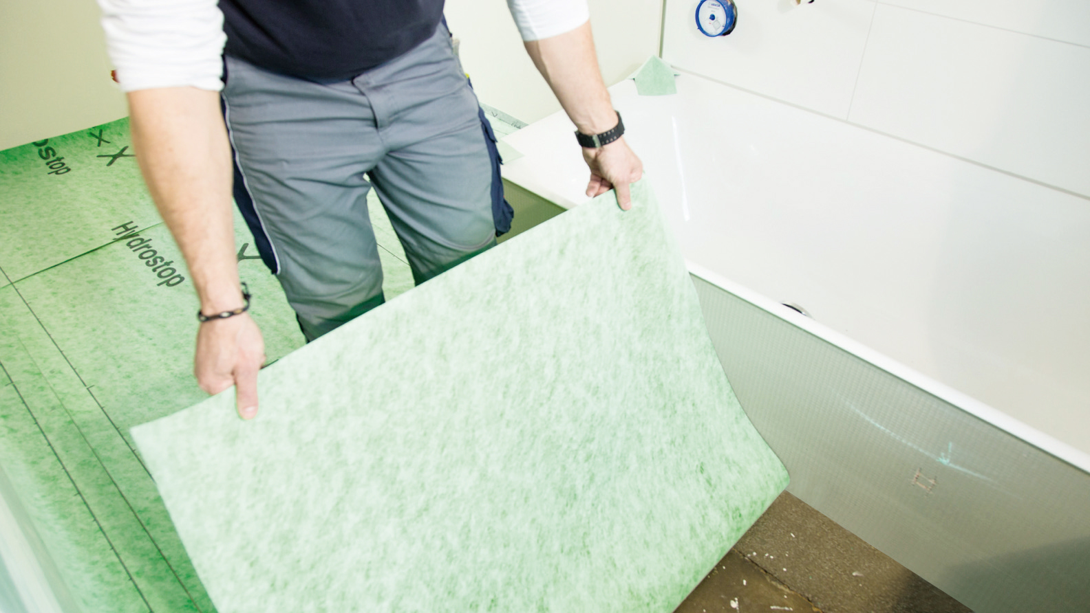 Pripravený pás hydroizolačnej podložky sa položí do čerstvého lôžka lepidla a celoplošne sa vyhladí korkovým hladidlom smerom od stredu k okrajom. Spod podložky je potrebné vytlačiť všetky prípadné vzduchové bubliny. Ďalšie pásy hydroizolačnej podložky sa lepia s presahom min. 50 mm.