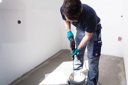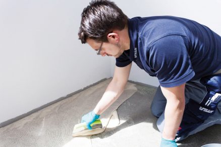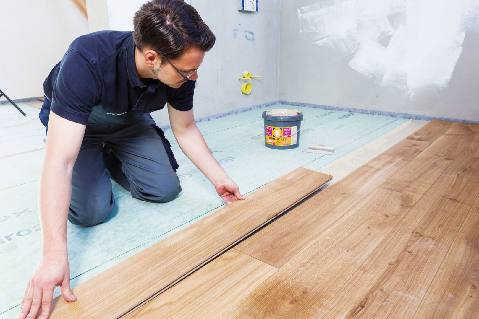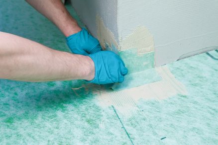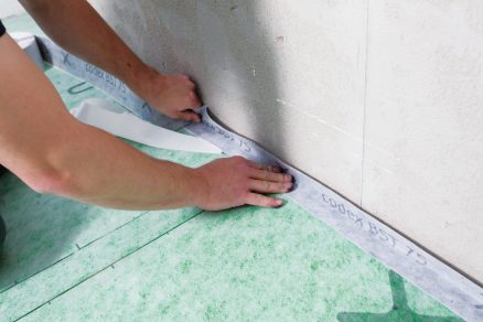 Miesta styku steny a podlahy sa utesnia samolepiacou tesniacou páskou. Zo spodnej strany samolepiacej tesniacej pásky sa odstráni ochranný pás a páska sa nalepí na stenu a podlahu. Po 24 hod. je možné začať s lepením drevenej podlahy.