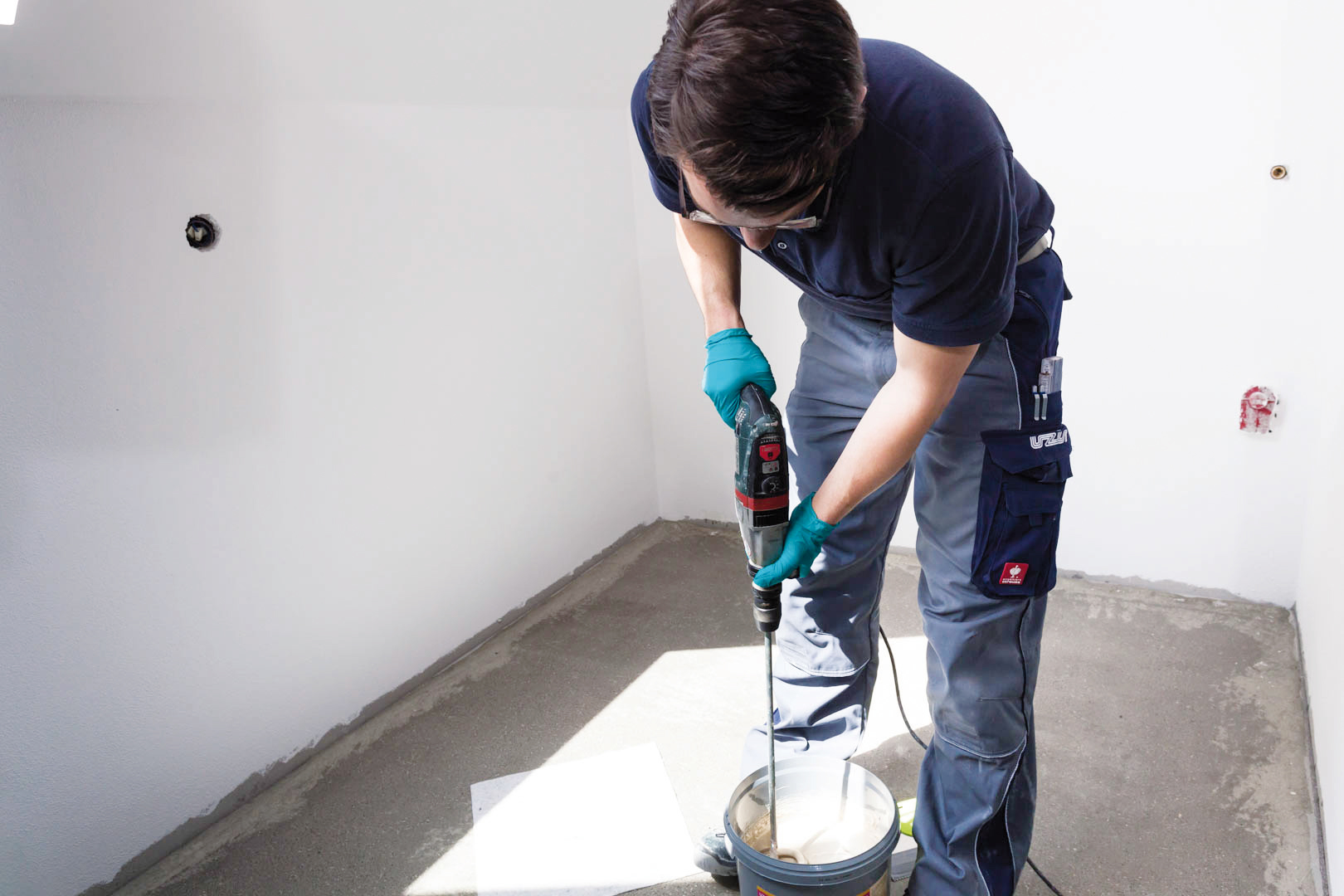 Dvojkomponentové polyuretánové parketové lepidlo sa nechá rovnako ako penetrácia aklimatizovať na priestorovú teplotu a živica s tvrdidlom sa dôkladne premiešajú elektrickým miešadlom so špirálovým nadstavcom.