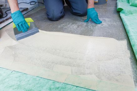 Rozmiešané lepidlo sa nanesie na podklad stierkou s ozubením B2. Na podklad sa nanesie len toľko lepidla, aby bola rubová strana hydroizolačnej podložky dobre zmáčaná.
