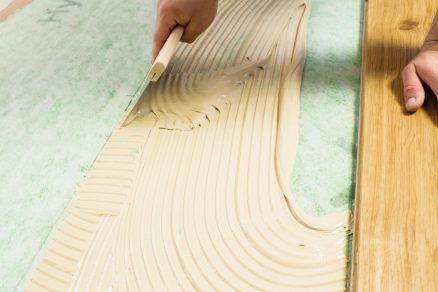 Jednotlivé drevené parkety sa uložia ľahko posuvným pohybom do lepidlového lôžka a pritlačia sa.