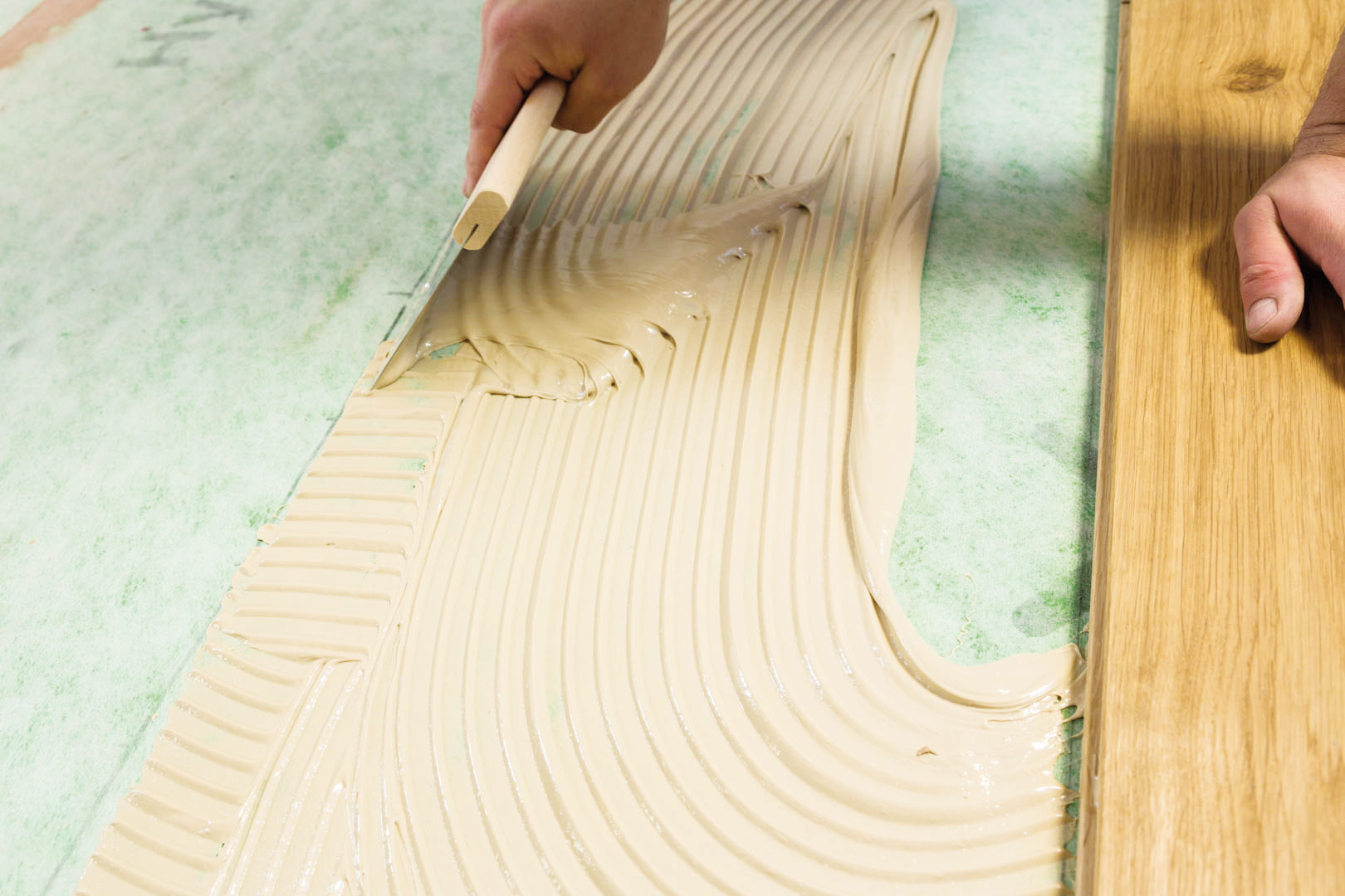 Rozmiešané dvojzložkové polyuretánové parketové lepidlo sa nanesie stierkou s ozubením vhodným na lepenie parkiet pozdĺž vopred vyznačenej zakladacej línie.