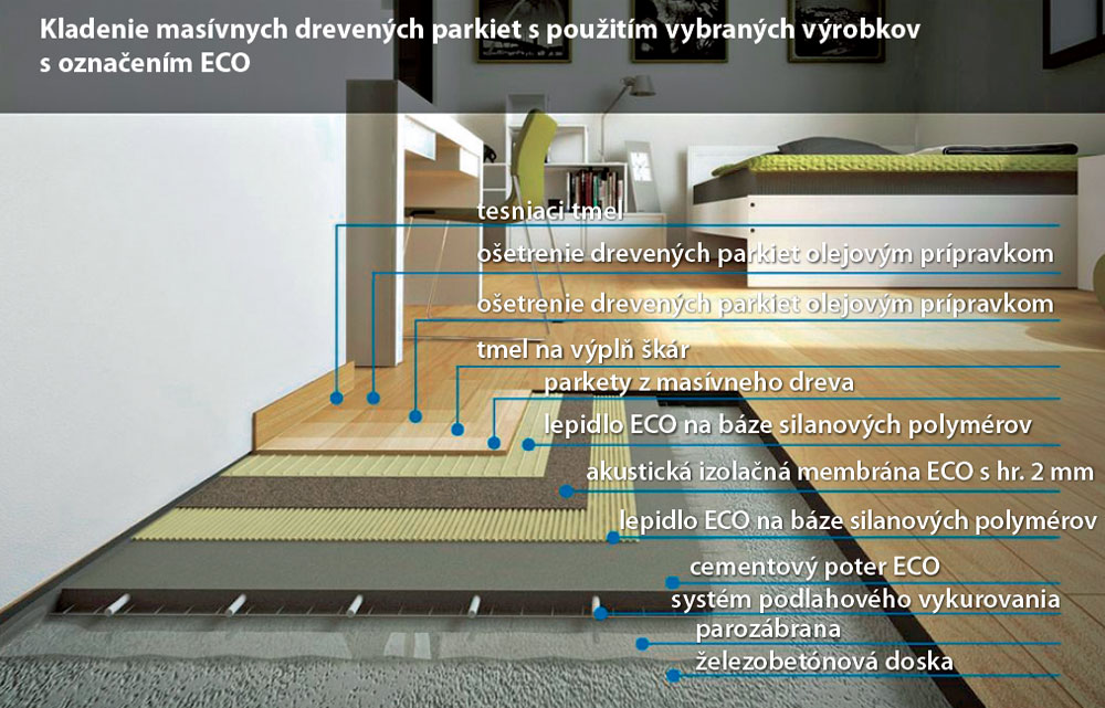 Pri návrhu interiérových podláh možno dnes vytvoriť kompletnú systémovú skladbu pozostávajúcu len z ekovýrobkov. Zahŕňa univerzálny penetračný náter na savé aj nesavé povrchy, cementovú nivelizačnú maltu, lepidlá na pružné povlakové krytiny alebo drevené parkety. Celý systém tak zdôrazňuje pridanú hodnotu v podobe bezpečného, garantovaného a technologicky moderného riešenia systémovej skladby, od podkladu až po lepidlá a laky na drevo. Označenie ECO výrobok sa však netýka len produktov určených na realizáciu podláh z pružných podlahových krytín, textílií a drevených parkiet, ale aj lepidiel vhodných na kladenie obkladových prvkov z keramiky a prírodného kameňa. Z tohto hľadiska sú teda výrobcovia súčasných materiálov stavebnej chémie schopní uspokojiť každého, či už inklinuje k príjemnej teplej drevenej podlahe alebo preferuje v súčasnosti čoraz viac v interiéroch používané prírodné linoleum.