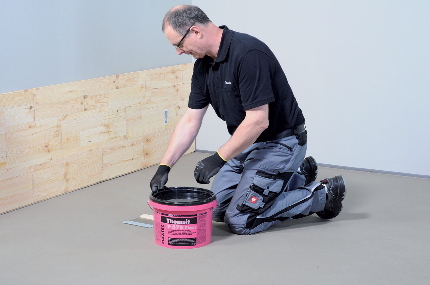 - Jednozložkové elastické lepidlo Thomsit P 675, spotreba: od 850 do 1 300 g/m2 (podľa ozubenia), plastová nádoba, 18 kg 107,50 €