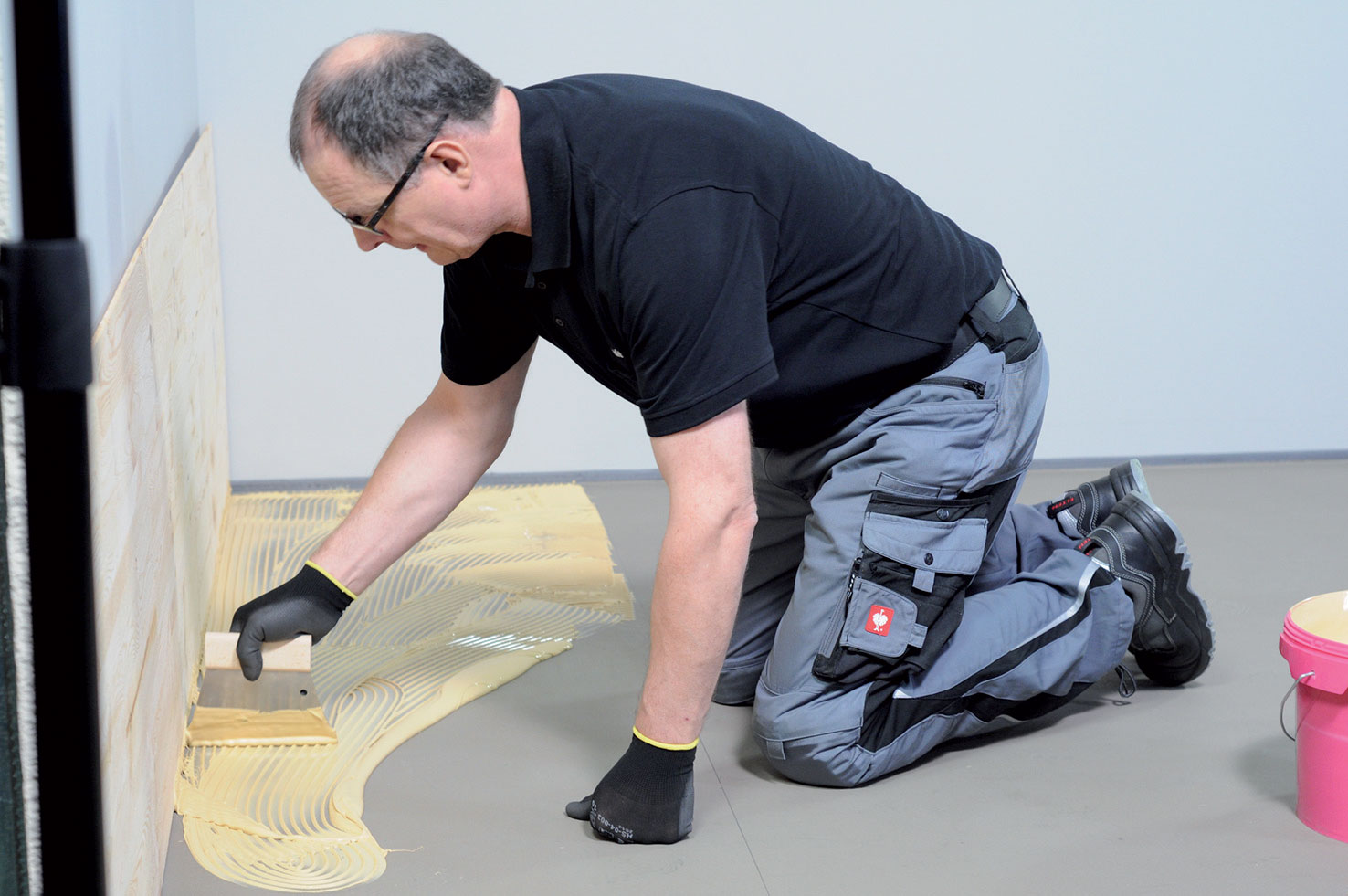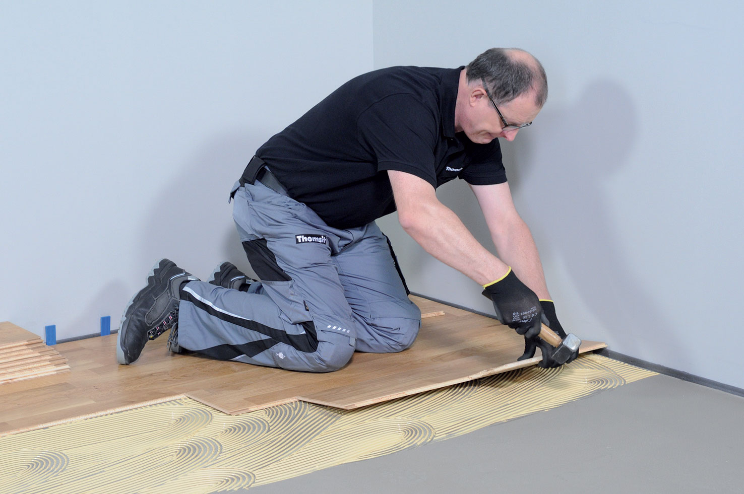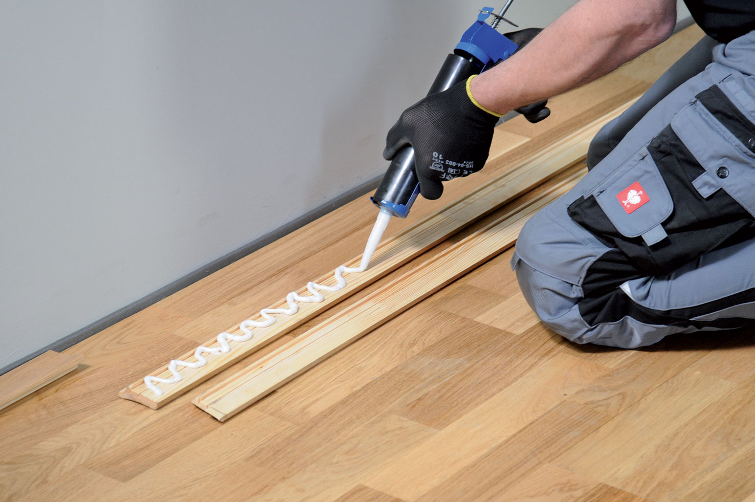 Zostavený diel sa zdvihne a premiestni tak, aby sa dalo na vyznačenú plochu naniesť lepidlo. Je vhodné použiť jednozložkové špeciálne lepidlo určené na lepenie drevených podláh. Lepidlo je vo forme pasty pripravené na okamžité použitie a môže sa nanášať priamo z plastovej nádoby.