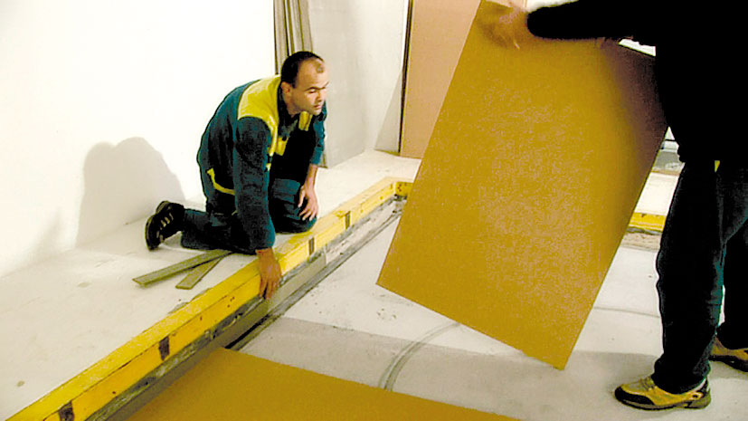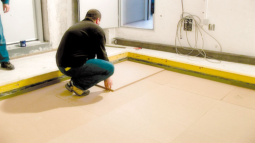 Vhodným materiálom sú drevovláknité dosky, ktoré sú charakteristické optimálnymi akustickými parametrami a mechanickou tuhosťou. Drevovláknité izolačné dosky sa kladú na podlahovú konštrukciu, pričom podklad musí byť rovný, suchý a dostatočne únosný. Kladú sa bez dilatačných škár v ploche. Ak sa použijú dve vrstvy izolačných dosiek, druhá vrstva sa ukladá na prvú s predsadením minimálne 200 mm. Cementotrieskové dosky sa začínajú ukladať oproti dverám, a to najskôr celou doskou.