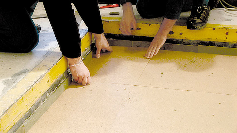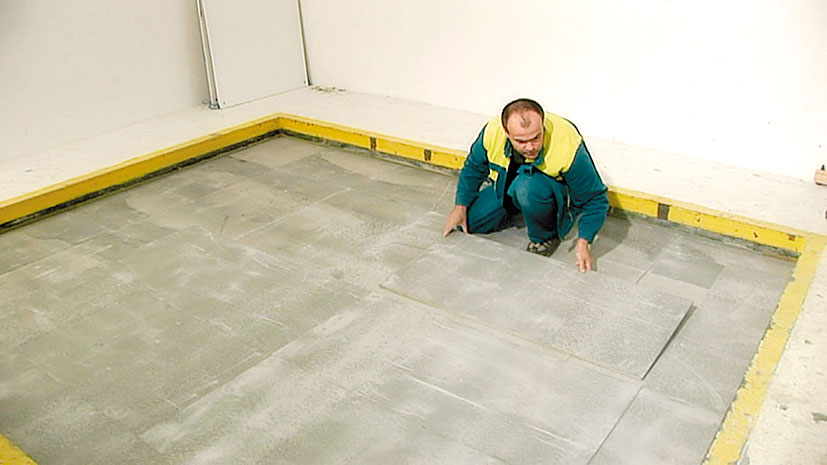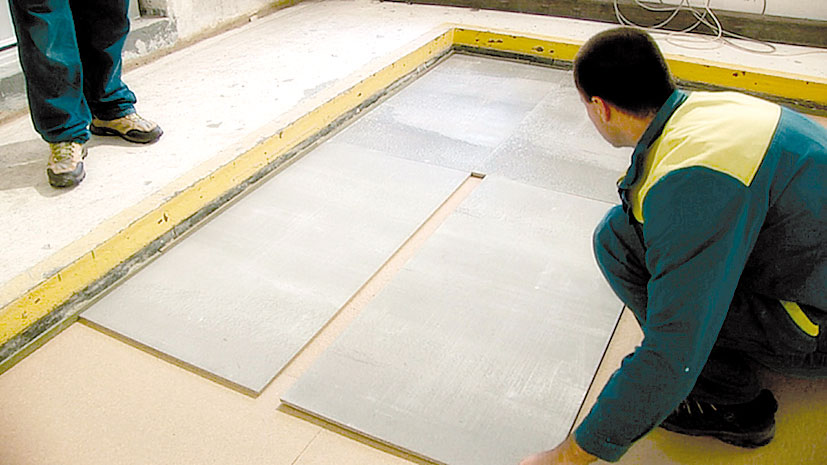 Cementotrieskové dosky sa začínajú ukladať oproti dverám, a to najskôr celou doskou. Kladú sa na zraz s krížovou škárou. Pred kladením by sa mali aklimatizovať v miestnosti – asi 48 hodín pri vlhkosti vzduchu maximálne 70 %. Je potrebné dbať na to, aby sa škáry izolačných a podlahových dosiek nenachádzali nad sebou.