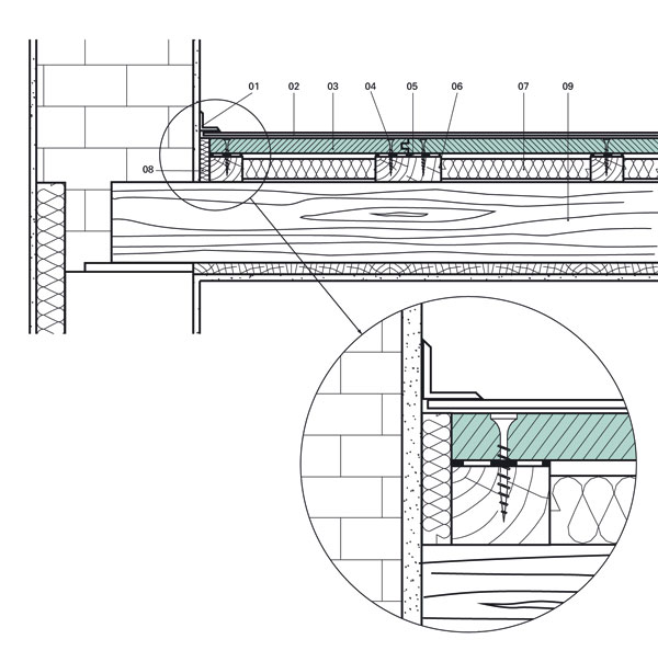 Tepelná a zvuková izolácia sa vkladá podľa nárokov medzi nosníky. Na zabránenie vzniku zvukových mostov sa zvuková izolácia s hrúbkou maximálne 5 mm kladie aj pod nosníky. Okolo stien je podlaha ukončená dilatačnou škárou so šírkou 15 mm. Do dilatačnej škáry okolo zvislých konštrukcií sa odporúča vložiť pás minerálnej vlny s hrúbkou 15 mm, ktorým sa zabráni zanášaniu škár nečistotami vznikajúcimi pri následných prácach. Tento pás sa odreže v potrebnej výške po dokončení finálnej úpravy povrchu podlahy pred ukladaním podlahovej krytiny.