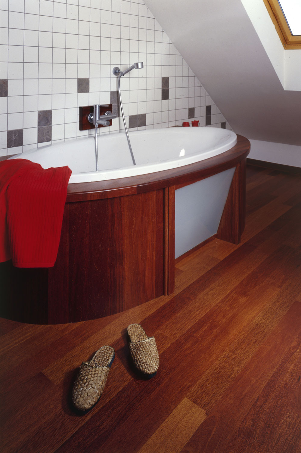 V kúpeľni sa však osvedčili najmä exotické dreviny, ktorým vyššia vlhkosť vadí menej a sú prirodzene odolnejšie proti hubám. Patričnú pozornosť treba venovať aj dilatačným škáram, najmä ich veľkosti v závislosti od druhu dreviny a utesneniu proti zatekajúcej vode. Samozrejmosťou je aj ich kvalitná povrchová úprava – lakovanie alebo olejovanie a pravidelná údržba. Treba však rátať s vyššou cenou. Cenovo je dostupnejšia drevená podlaha z domácich drevín (smrekovec, dub, agát). Niektoré exotické tvrdé dreviny pre exteriér typu bangkirai sa vyhotovujú ako rošt.