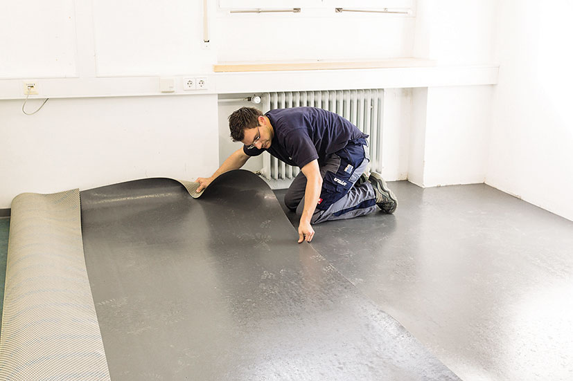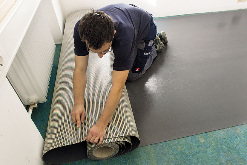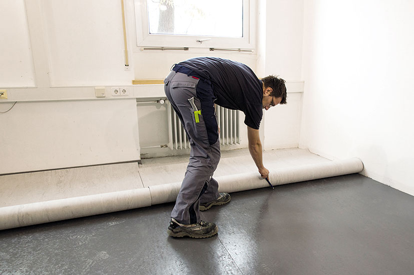 Následne možno ihneď začať s kladením samotnej podlahoviny. Podlahovina sa rozloží. Konce podlahových pásov sa zrežú nahrubo, pozdĺžne švíky presne. Polovica pásu sa potom preloží naspäť.