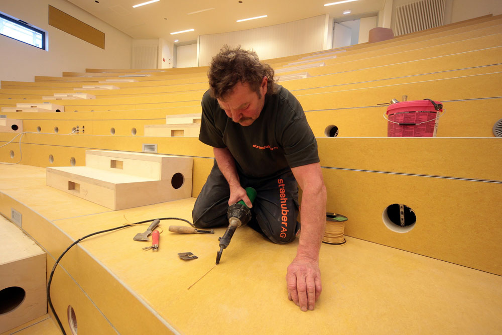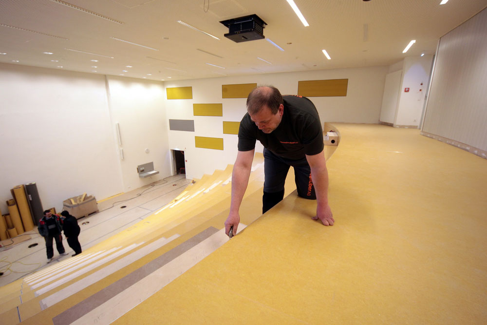 Aby sa podlahári vyhli stekaniu lepidla na zvislých plochách, použili na lepenie linolea na schodovité sedenie v posluchárni metódu kontaktného lepenia. Záverečné zváranie linolea