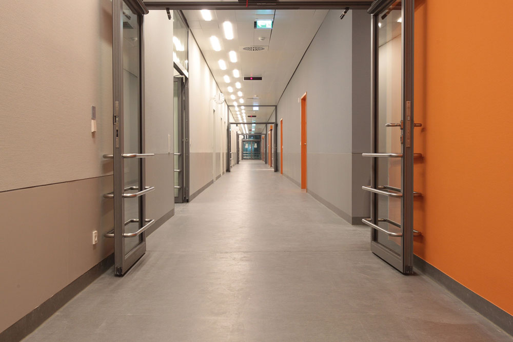 Na dvoch podlažiach sa realizovali anhydritové duté podlahy, na ostatných podlažiach betónové potery (približne 80 %) – s disperzným základným náterom Thomsit R 766, ako stierka sa použila rýchlotvrdnúci samonivelačný vyrovnávací materiál Thomsit DX s nízkou prašnosťou pri miešaní, nízkym pnutím a s vysokou pevnosťou alebo expresný vyrovnávací materiál Thomsit XXL Xpress s veľmi nízkou prašnosťou (prípadoch, keď bol nevyhnutný rýchly postup). Kobercové krytiny sa lepili lepidlom Thomsit T440 (na plochách s revíznymi otvormi v kombinácii s fixačnou páskou (Thomsit DT 700). Linoleum vo vodorovnej polohe sa lepilo lepidlom Thomsit L 240 D, na zvislé plochy sa použil Thomsit K 188 E.