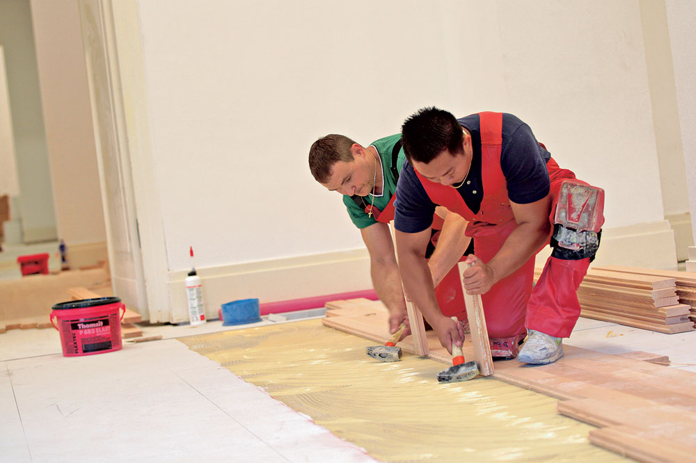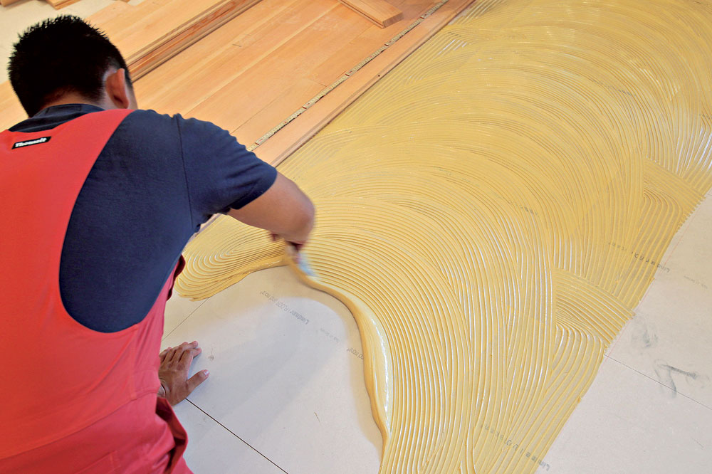 Na lepenie parkiet sa použilo jednozložkové vysokoelastické silanové lepidlo vhodné na lepenie drevených podláh. Elastické lepenie zmenšuje napätie v šmyku, a tým dlhodobo zamedzuje vzniku ťahových síl v podklade. Výhodou lepidla je priľnavosť k rozličným podkladom. Lepidlo sa nanášalo na povysávanú, ale inak nepredpripravenú podlahu – penetrácia podkladu nebola nutná. Vďaka takzvanému času otvorenia lepidla 25 až 40 minút mali podlahári dostatok času, aby skompletizovali nové a pôvodné parketové dielce presne podľa predstáv pamiatkarov.