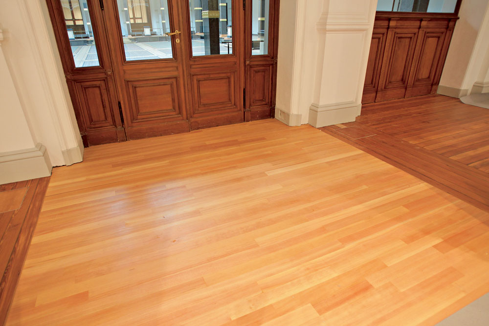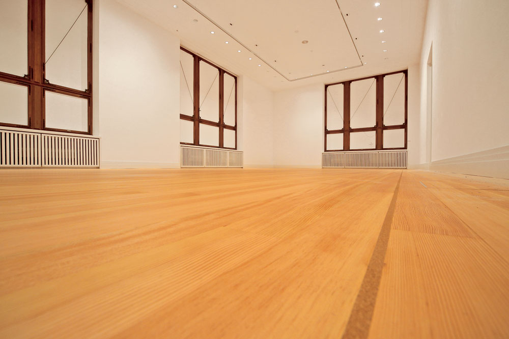 Po vykonaní prvého prieskumu sa zistilo, že pôvodný podklad bol realizovaný z parkiet z oregonskej borovice s hrúbkou 32 mm. Pôvodne bol vo výstavných halách položený smrekovec, v sedemdesiatych rokoch minulého storočia ho však vymenili za robustné dosky z ušľachtilého dreva oregonskej borovice, ktoré sa používajú na realizáciu pódií. Na obnovu podláh v múzeu sa museli vyrobiť nové dosky. Drevo sa prepravilo loďou z USA do Nemecka a tu sa upravilo na dosky s hrúbkou 28 mm. Drevená podlaha tohto druhu sa nenachádza nikde inde na svete. Ide o jedinečný produkt, vyrobený na mieru.
