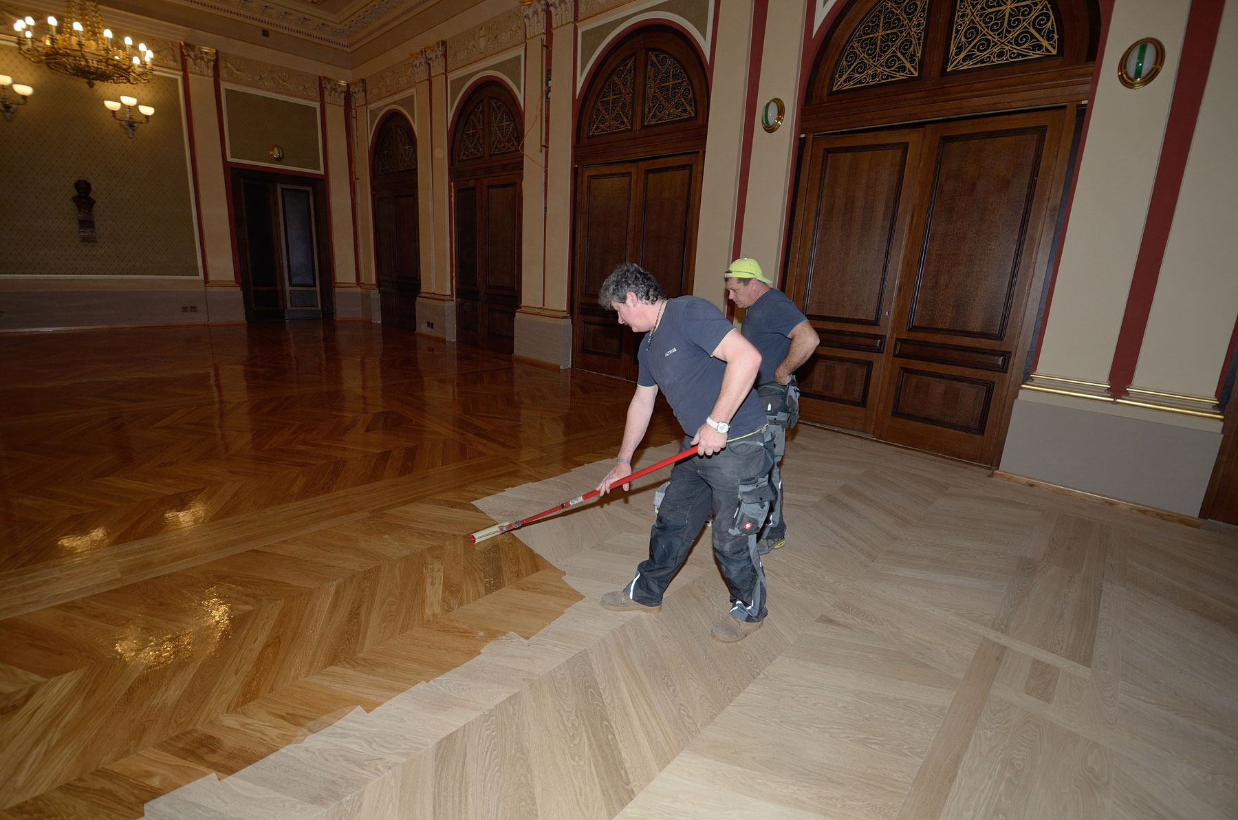 V najväčšom priestore, Dvorane, s celkovou rozlohou 500 m2 sa muselo nutne lokálne vymeniť cca 30 m2 tabuľových kaziet. Následne prebehla celková renovácia podlahy. Vo všetkých priestoroch sa úspešne vyskúšala nová brúska Bona Belt HD s keramickým a zirkónovým brúsivom Bona. Všetky plochy sú vytmelené tmelom Bona Mix&Fill Plus a ošetrené dvomi vrstvami Bona Tvrdého voskového oleja (Bona Hard Wax Oil). Ďalej sa tu navrhol údržbový plán, ktorý sa bude postupne upresňovať podľa aktuálneho opotrebovania.