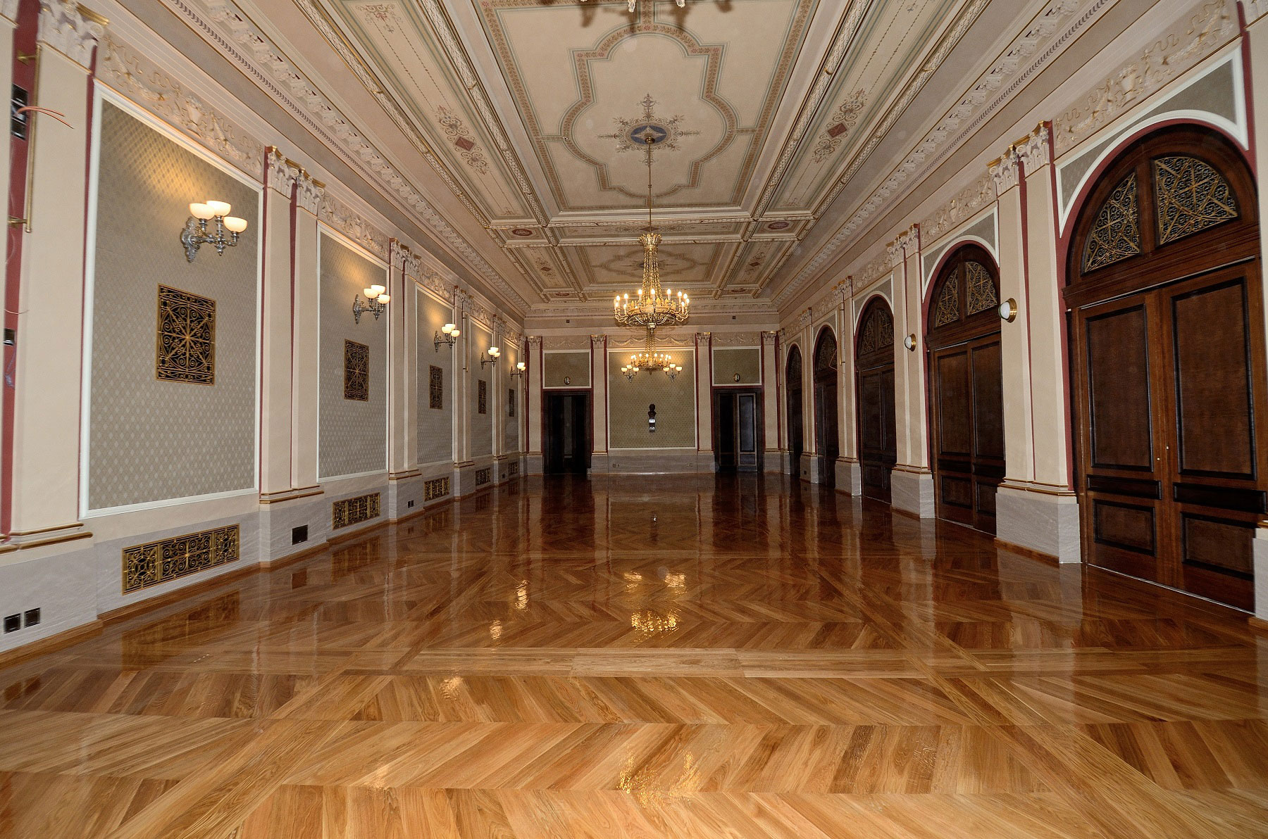 V Sukovej sieni firma Altryss nalepila 300 m2 nových masívnych dubových podláh na nový podklad z rýchloschnúceho betónu. Použilo sa lepidlo Bona R850. Masívne dubové prvky sa lepili do maďarského vzoru a celá plocha je rozdelená bordúrami. V Stĺpovej sieni, ktorú realizovala firma Procházka Parket, bolo nutné demontovať staré parkety a pôvodný doskový záklop. Po vyrovnaní podkladových trámov a dorovnaní zásypu boli opracované dosky namontované späť. Následné ukladanie cca 230 m2 sa realizovalo pribíjaním do maďarského vzoru a opäť s veľkým množstvom bordúr.