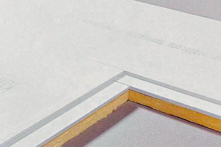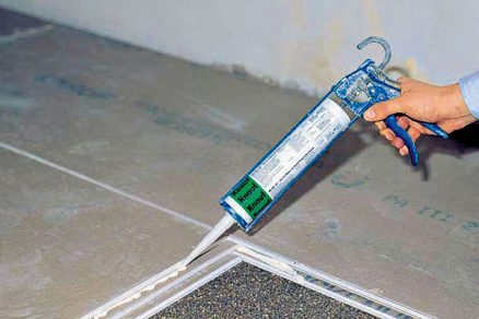 Pri správnom nanesení dostatočného množstva lepidla sa malé množstvo zo škáry vytlačí. Prebytočné lepidlo sa po zaschnutí očistí stierkou. Detail zámku sadrovláknitej podlahy podlepenej minerálnou vlnou