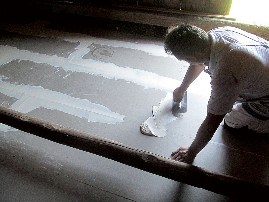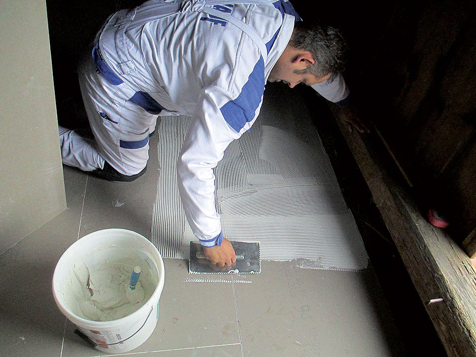 Sadrový tmel (napr. Fugenfűller Leicht) sa rozmieša s vodou vo vedre pomocou lopatky na sadrové zmesi (približne 2,5 kg suchej zmesi/1,9 l vody) na smotanovú zmes bez hrudiek. Pomocou lopatky sa rozmiešaný tmel nanesie na prvú vrstvu podlahových dosiek a celoplošne sa rovnomerne roztiahne zubovým hladidlom.