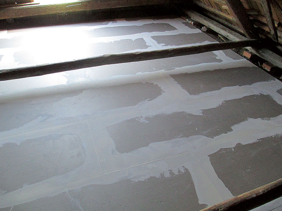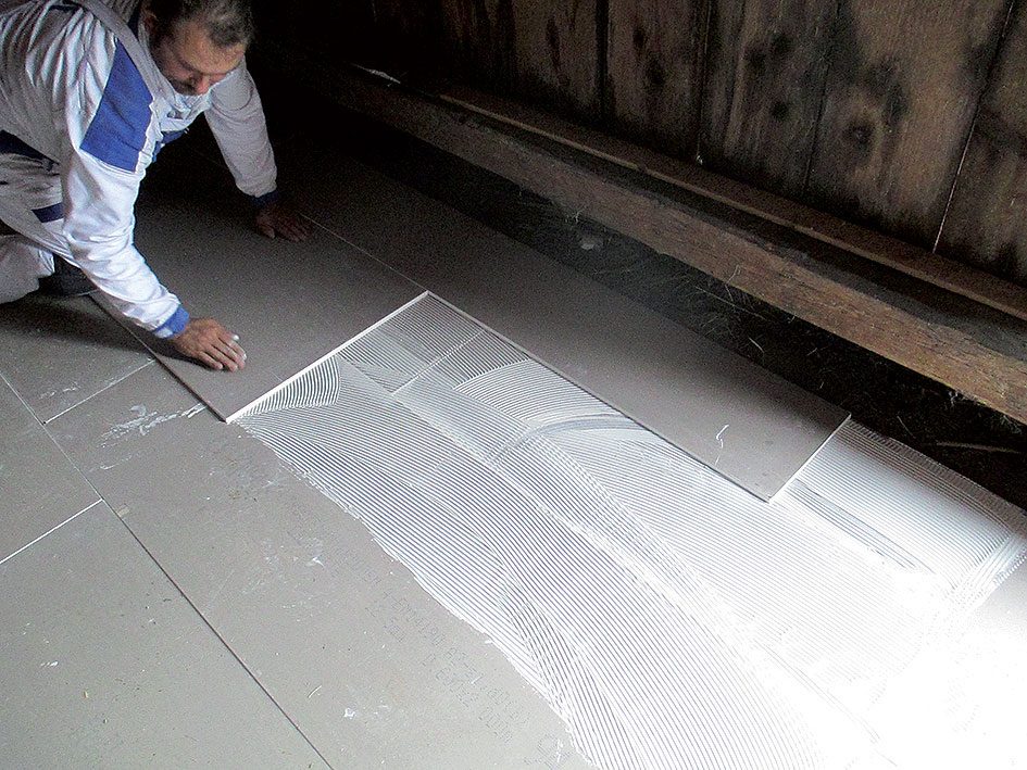 Podlaha sa kladie od konca miestnosti smerom k dverám, a to s presahom tak pozdĺžnych, ako aj priečnych spojov. Ako prvé sa kladú dosky, ktoré sú označené v montážnej schéme číslami. Sadrový tmel (napr. Fugenfűller Leicht) sa rozmieša s vodou vo vedre pomocou lopatky na sadrové zmesi (približne 2,5 kg suchej zmesi/1,9 l vody) na smotanovú zmes bez hrudiek. Pomocou lopatky sa rozmiešaný tmel nanesie na prvú vrstvu podlahových dosiek a celoplošne sa roztiahne zubovým hladidlom tak, aby bola vrstva lepiaceho tmelu rovnomerná. Na podlahu sa odporúča aplikovať len toľko tmelu, aby sa pri jeho sťahovaní opierali zuby hladidla o povrch dosky. Tmel sa nanáša maximálne na dve dosky. Na prvú vrstvu podlahy s naneseným tmelom sa položí druhá vrstva podlahových dosiek opäť s presahom spojov o 300 mm. Po položení prvej dosky do vrstvy tmelu treba skontrolovať rovinnosť položenej dosky pomocou vodováhy a v prípade potreby ju dorovnať poklepom gumeným kladivom alebo pritlačením rukou (vlastná hmotnosť).