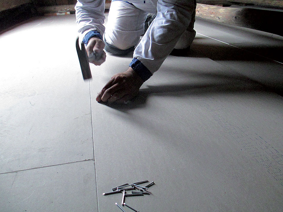 Uložená a vyrovnaná doska druhej vrstvy sa zafixuje pomocou podlahových klincov 1,5 × 25 mm, ktoré sa zatlčú v štvorcových odstupoch po 300 mm (na krátkej strane tri klince a na dlhej strane sedem klincov). Spotreba klincov na jednu dosku je 21 klincov.