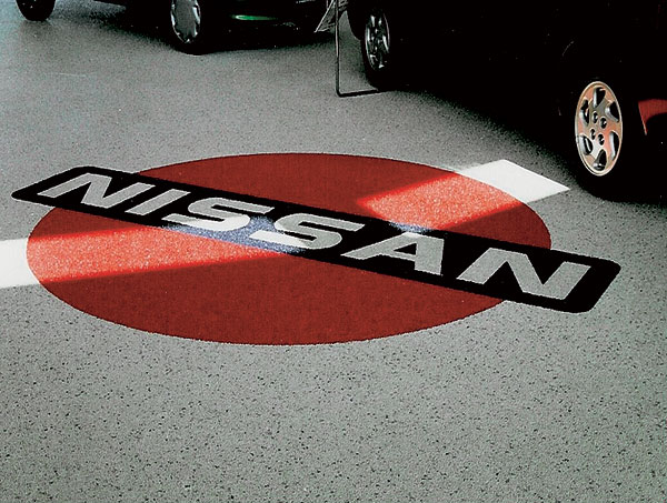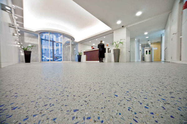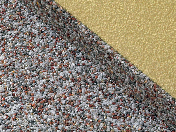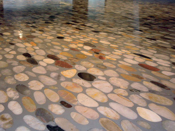 Veľmi zaujímavou alternatívou je koncept kamenných kobercov. Kamenivo/piesok v prakticky akejkoľvek frakcii a farbe (alebo aj prírodné) sa zmiešava s čírou živicou a kladie sa priamo na predpripravený povrch. Možno vytvárať rozličné farebné variácie, logá alebo napríklad zapustiť do podlahy LED diódy (obr. 6).
