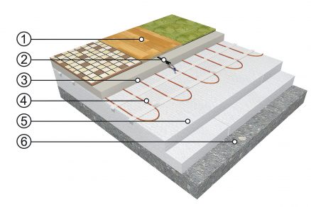 1 – nášľapná vrstva (napr. dlažba), 2 – podlahová (limitačná) sonda v ochrannej trubici (tzv. husí krk), 3 – nosná anhydritová platňa, 4 – vykurovacia rohož (kábel) ECOFLOOR®, 5 – tepelná izolácia, 6 – podklad (betónová platňa).