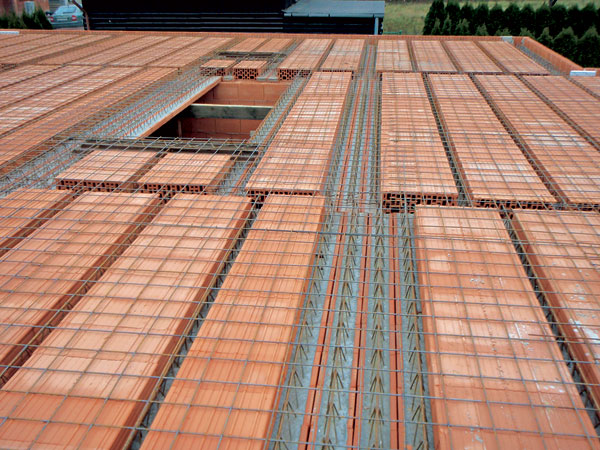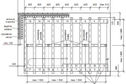 Betonáž možno začať až po uložení všetkých stropných vložiek, potrebnej výstuže navrhnutej do nadbetonávky, a to vrátane výstuže vencov, stropných nosníkov – výmen, príložiek, prievlakov a podobne (obr. 9). Pri oceľových prievlakoch sa musí realizovať spriahnutie s nadbetonávkou a v závislosti od typu schodišťa realizácia prípravy na uloženie schodišťového ramena. V súlade s ďalšími výkresmi treba osadiť napríklad chráničky, prípadne kotvenie nadväzujúcej konštrukcie (zábradlie, krov a podobne), uložiť elektroinštaláciu.