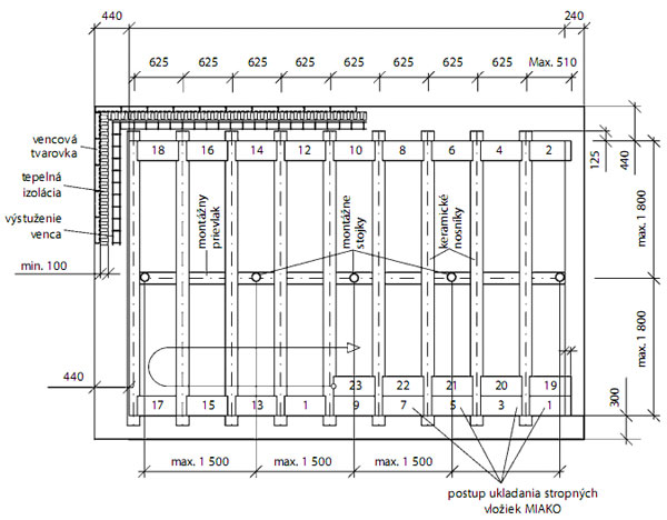 Stropné vložky MIAKO, ktoré majú pre všetky typy stropných konštrukcií rovnakú dĺžku 250 mm, sa ukladajú nasucho na stropné nosníky. Najskôr sa uložia vložky po jednom rade na obidvoch koncoch nosníkov, čím sa vymedzí osová vzdialenosť nosníkov. Potom sa postupne ukladajú stropné vložky v radoch tak, aby bola práca plynulá. Stropné vložky sa vždy ukladajú v smere pozdĺžnej osi nosníkov (obr. 11). Odporúčaná hodnota minimálneho uloženia stropných vložiek na nosnom murive z bočnej strany je 25 mm (obr. 8a, b).