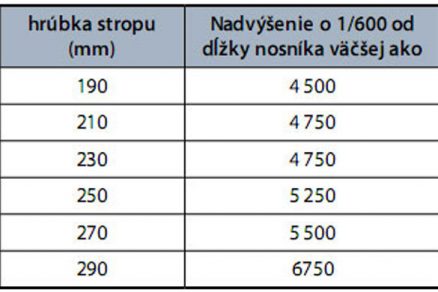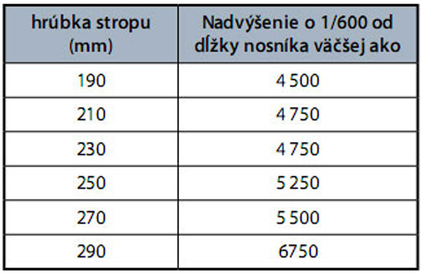 Stropné nosníky treba ihneď po uložení na murivo v montážnom štádiu podoprieť, a to líniovými podperami vytvorenými napríklad z vodorovných drevených hranolov alebo z trámov systémového debnenia. Vzdialenosť medzi podperami navzájom alebo medzi podperou a nosným murivom môže byť maximálne 1 800 mm. Tieto líniové podpery sa musia podoprieť stĺpikmi vo vzdialenosti maximálne 1 500 mm, poprípade celá podperná konštrukcia sa musí navrhnúť výpočtom. Podperné stĺpiky, teleskopické alebo podložené dvoma klinmi z dôvodu ich ľahkej demontáže, sa musia zavetriť. Pri realizácii stropov súčasne vo viacerých podlažiach musia stáť podperné stĺpiky zvislo nad sebou. Od určitých rozpätí v závislosti od hrúbky stropnej konštrukcie sa odporúča stropné nosníky nadvýšiť (tab. 1)