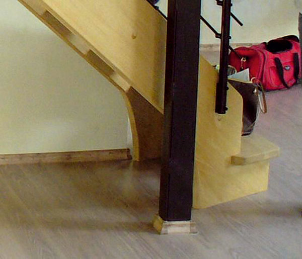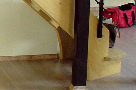 - za ďalší problematický detail z hľadiska krokového hluku možno označiť uloženie schodísk v mezonetových bytoch. Nosná konštrukcia schodiska je vo väčšine prípadov ukotvená do nosnej stropnej konštrukcie bez prerušenia akustického mosta. Pri chôdzi po schodisku tak prichádza k priamemu prenosu štrukturálneho zvuku do stropnej konštrukcie (obr. 3).