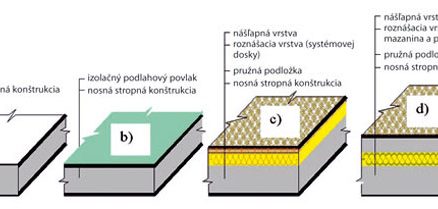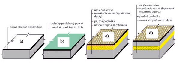 Obr. 1: Schematické znázornenie a) holé stropné konštrukcie, b) stropné konštrukcie s izolačným podlahovým povlakom, c) s ľahkou plávajúcou podlahou, d) s ťažkou plávajúcou podlahou