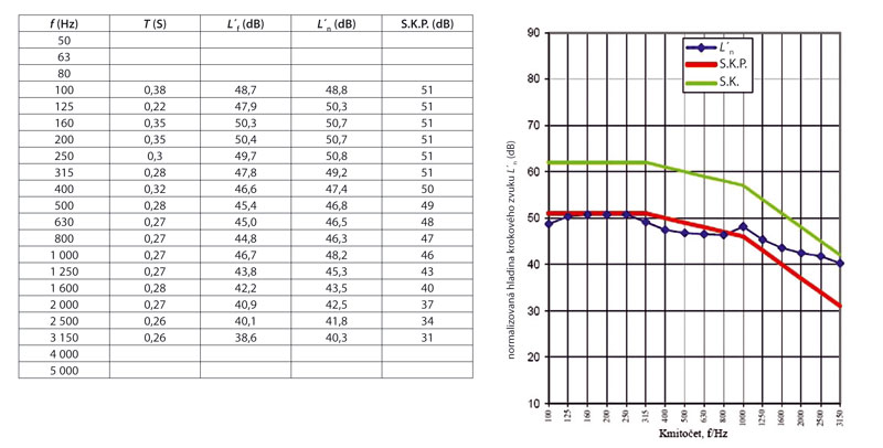 - Stropná konštrukcia vrátane podlahy vyhovuje normatívnym požiadavkám – hodnotila sa z hľadiska krokovej nepriezvučnosti v súlade s STN EN ISO 140-7, STN EN ISO 717-2 a STN 73 0532. Tieto normy sa používajú na vyhodnotenie zvukovoizolačných vlastností konštrukcie v rozsahu 100 − 3150 Hz, prípadne v rozšírenom kmitočtovom rozsahu 50 – 5 000 Hz, sú iba informatívne a v rámci danej problematiky sa javia ako neoptimálne, t. j. nevyhodnocujú zvukovoizolačné vlastnosti stropnej konštrukcie vrátane podlahy v sledovanej oblasti nízkych kmitočtov (31,5 − 40 Hz).
