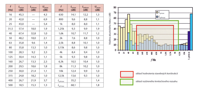 - Spektrálnou analýzou zdroja hluku (pohybu osôb po stropnej konštrukcii) sa zistilo, že ide o zdroj hluku s výraznými tónovými zložkami v oblasti nízkych kmitočtov (31,5 − 40 Hz), teda mimo oblasti hodnotenia krokovej nepriezvučnosti stropnej konštrukcie podľa platnej legislatívy.