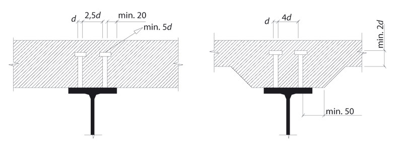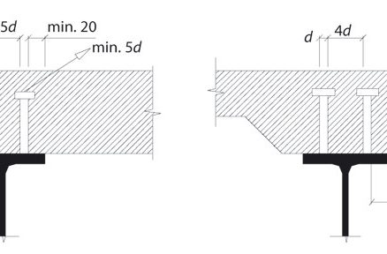 - vzdialenosť medzi okrajom pásnice oceľového nosníka a okrajom spriahovacieho tŕňa, ktorý je k pásnici privarený, musí byť väčšia ako 20 mm;