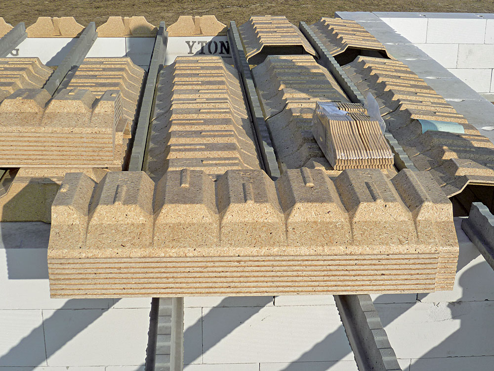 Obr. 7 Strop rodinného domu v Borskom Mikuláši – ako prvé sa položia krajné stropné vložky so stranou zapadajúcou do krycieho prvku. Ďalšie stropné vložky v rade sa ukladajú systémom pero a drážka s presahom od 1 cm do 6 cm.