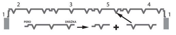 V prípade chýbajúcej časti, ktorá je menšia ako samotná stropná vložka, sa táto doplní odrezaním vložky na požadovanú vzdialenosť, pričom sa rez vedie v jej hornej časti. Miesto rezu možno regulovať posunom vložiek na prerodrážke (obr. 5).