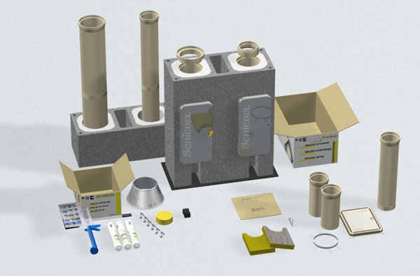 Komínové systémy spoločnosti pozostávajú z kompatibilných prvkov, ktoré si spoločnosť vyrába sama vo svojich závodoch. Betónové tvárnice sa vyrábajú v Olomouci a Nehvizdoch pri Prahe. V závodoch v nemeckom Wiesau, resp. v českom Zlive vznikajú keramické vložky. Komíny Schiedel sú preto zárukou súhry komponentov, bez skladania prvkov od viacerých dodávateľov. Jednotlivé časti do seba zapadajú a vytvárajú dokonalý celok bez nedostatkov.