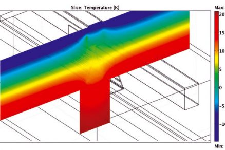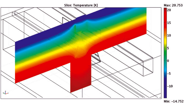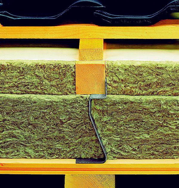 Výpočtová simulácia nadkrokvového držiaka. Pri tomto riešení tepelnej izolácie strešného plášťa treba voliť dostatočnú hrúbku tepelnej izolácie tak, aby v styku nadkrokvového držiaka a záklopu nevznikalo studené miesto s možnosťou kondenzácie vodnej pary. |