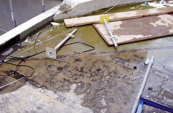 | Obr. 3 Hydroizolácia vytiahnutá na atiku bola na konci (betónovej obruby) zabetónovaná inou konštrukciou. Ďalšie asfaltové pásy nemožno bez vybúrania betónovej konštrukcie v tejto časti stavby nataviť. Oprava neprístupných miest na napojenie hydroizolácií je teda pomerne nákladná. Asfaltové pásy nie sú v tomto prípade dostatočne chránené proti poškodeniu, pretože sú na nich položené ostré predmety, časti lešenia. |