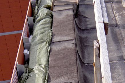| Obr. 1 Ak zateplenie stien zhora na atikách zostane dlhší čas nezabezpečené proti vode (napr. dva alebo aj viac mesiacov), môže vzniknúť problém so zatekaním do zateplenia stien a následne aj do strešného plášťa. Najlepším riešením je vytiahnutie vodotesných izolácií zo strechy až na vonkajšiu stranu zateplenia stien budovy. | Obr. 2 Chyby pri postupe výstavby môžu vyplývať z mnohých rozličných príčin. Niekedy je nevyhnutné zasiahnuť do dokončeného strešného plášťa, na výstavbu ďalších konštrukcií prerezať povlakovú krytinu a vybrať zo strešného plášťa časť tepelnej izolácie. Strešný plášť treba pozdĺž prerezanej oblasti zabezpečiť proti zatečeniu. Otvorený strešný plášť treba v miestach novej konštrukcie rozrezávať postupne a okraje skladby strechy treba ihneď vodotesne uzatvárať. Ak necháme otvorenú strechu dlhší čas nezabezpečenú proti zatekaniu, po prvých prívalových dažďoch sa poškodí tepelná izolácia v strešnom plášti a vzniknú škody aj na ďalších stavebných konštrukciách a vybavení budovy. |