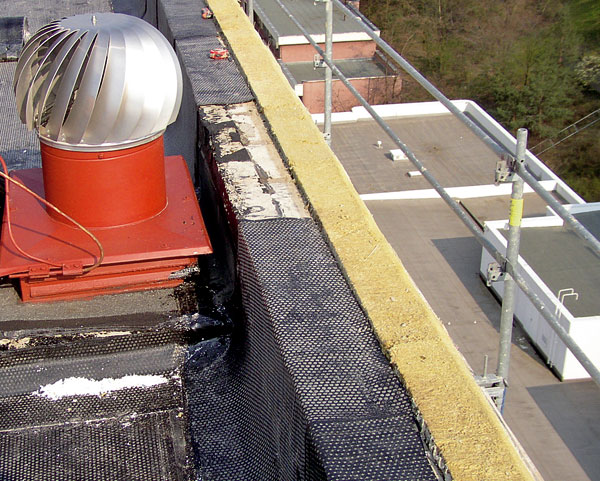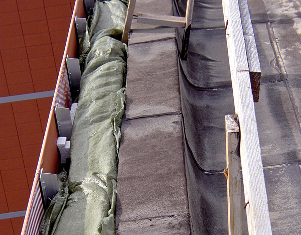 | Obr. 5 Na plochých strechách dochádza v oblasti atík k styku tepelných a vodotesných izolácií. Pri dokončenom detaile atík je vrch atík väčšinou prekrytý oplechovaním. Tepelnú izoláciu treba aj počas stavby chrániť proti vode. |