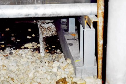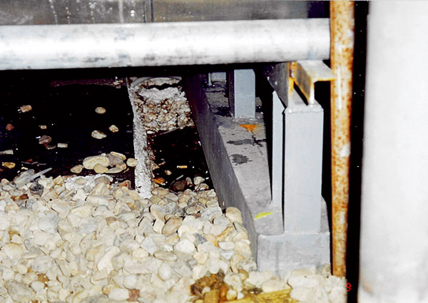 Obr. 6 V niektorých prípadoch by sme mohli montáž technického zariadenia na plochej streche označiť ako bezohľadnú. Nájdenie príčiny zatekania do strechy budovy bolo v tomto prípade možné až po odokrytí vrstvy kamenia pod klimatizačnou jednotkou. |