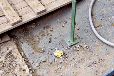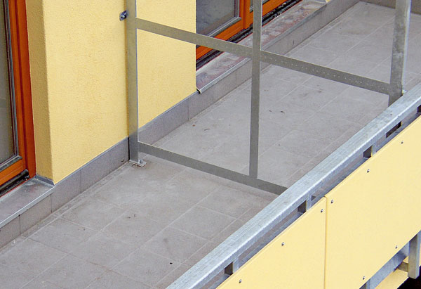 | Obr. 7, 8 Realizácia montáže niektorých kovových konštrukcií je dôkazom veľmi zúženého pohľadu na proces výstavby budov. Deliace steny alebo zábradlia je optimálne pripevniť na hydroizolácie pomocou zvieracích (prírubových) spojov, a nie navŕtaním kotvových prvkov cez vodotesnú izoláciu do podkladovej konštrukcie. | |
