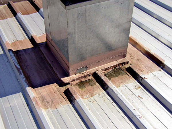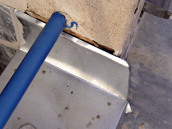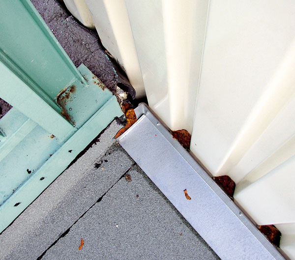 | Obr. 13, 14 Vonkajší povrch plochej strechy alebo obvodového plášťa budovy môžu tvoriť aj trapézové plechy. Sú tvarovo zložité na vodotesné opracovanie detailov. Navyše, v dôsledku teplotných zmien sa kovové konštrukcie dosť pohybujú. Nalepovanie asfaltových pásov, zatmeľovanie škár alebo vypĺňanie škár polyuretánovou penou nepatrí medzi správne riešenia utesnenia detailov pri trapézových plechoch. | |