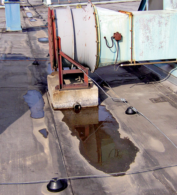 Obr. 17 Pri navrhovaní nového vzduchotechnického zariadenia na plochej streche treba podkladové a pomocné konštrukcie umiestniť mimo žľabov, úžľabia, a nie v tesnej blízkosti strešných vpustov, teda inak, ako vidno na obrázku. |