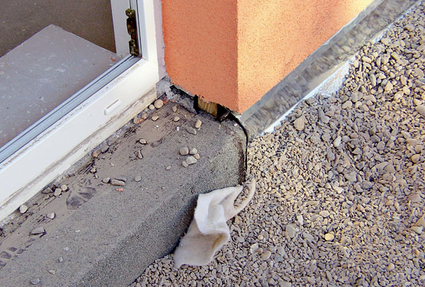 | Obr. 15 Pri rekonštrukcii strešného plášťa sa svetlíky položili spodnou hranou na zabezpečovací asfaltový pás – parozábranu. Po realizovanej betónovej mazanine v spáde pokračovala montáž strešného plášťa vrstvou tepelnej izolácie a natavením dvojvrstvovej hydroizolácie. V technologických predpisoch výrobcu plastových svetlíkov sa však uvádzalo: na šikmé steny plastových svetlíkov sa nesmú kotviť nijaké hydroizolácie alebo klampiarske prvky a hydroizolácie sa nemôžu klásť na steny plastového svetlíka pomocou plameňa horáka. | Obr. 16 Chybný postup prác, keď sa zateplenie stien pri dverách realizovalo na stavbe skôr ako vodotesné izolácie. Oprava nedokončených kútov pri dverách je pomerne problematická, pretože hydroizolácie sú zakryté inými materiálmi a bez rekonštrukcie detailov ich väčšinou nemožno vodotesne napojiť a ukončiť. |