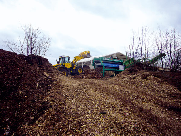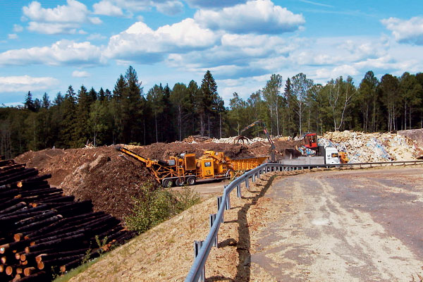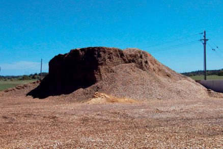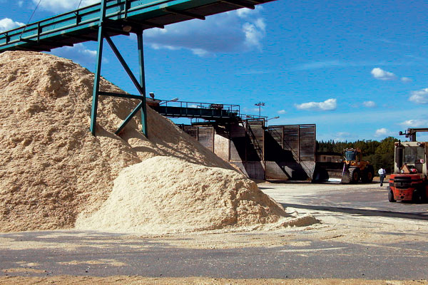 | Obr. 3: Voľné uskladnenie biopaliva pri kotolni – zdroji energie – a detail drevnej štiepky, skúsenosti zo Švédska | |
