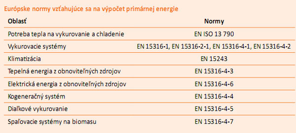Na obr. 2 sú schematicky znázornené energetické toky v budove s uvažovaním obnoviteľných zdrojov energie. Pri výpočte sa použijú európske normy uvedené v tabuľke.
