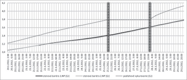 Obr. 5  Priebeh spotreby tepla (GJ) stenovou bariérou a podlahovým vykurovaním v čase od 20. 1. do 30. 1. 2012